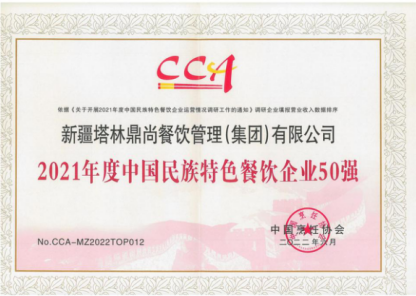 多次獲得大型比賽獎項 公司先后取得2019年全國百強企業,2020年清真餐飲百強企業,GB/T 19001-2008/ISO 9001:2008質量管理體系認證,GB/T 22000-2006/ISO 22000:2005及GB/T 27306-2008食品安全體系認證。近年來獲得“國際酒店4D管理示范企業”“中國誠信供應商”“克拉瑪依消費維權誠信企業”“中國餐飲企業知名品牌”“中國餐飲30年優秀企業”“2016年度中國清真餐飲“金駱駝”獎最具影響力優秀品牌”“2017年度百家中國好食堂”“全國綠色餐飲企業”